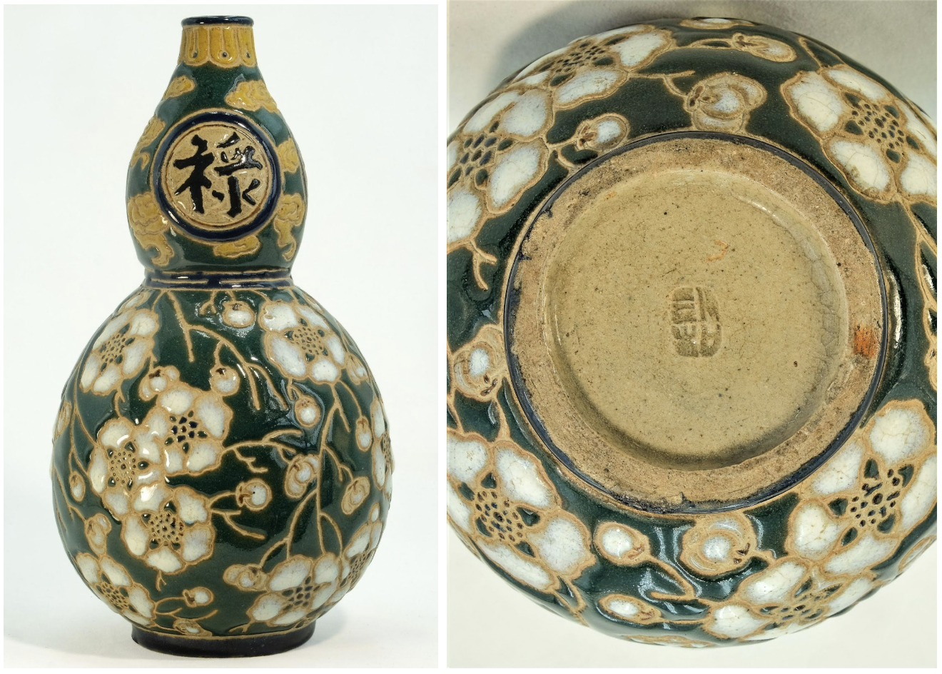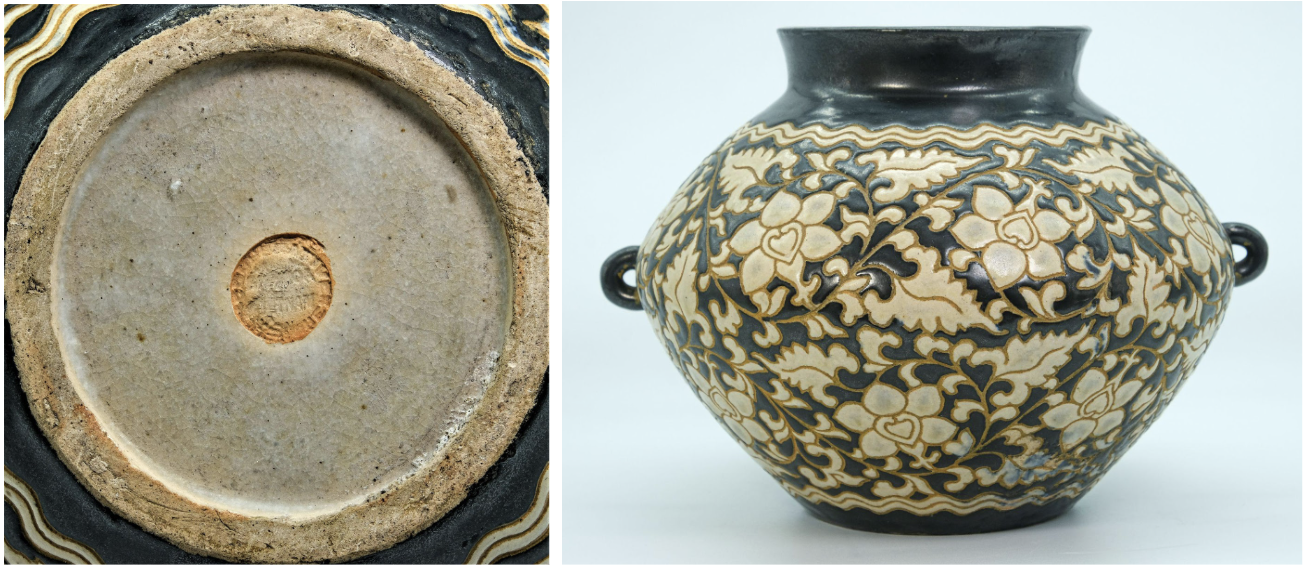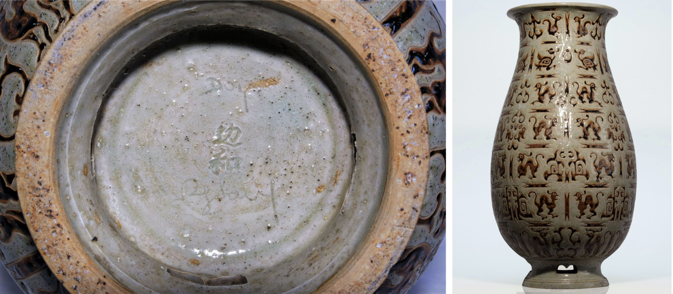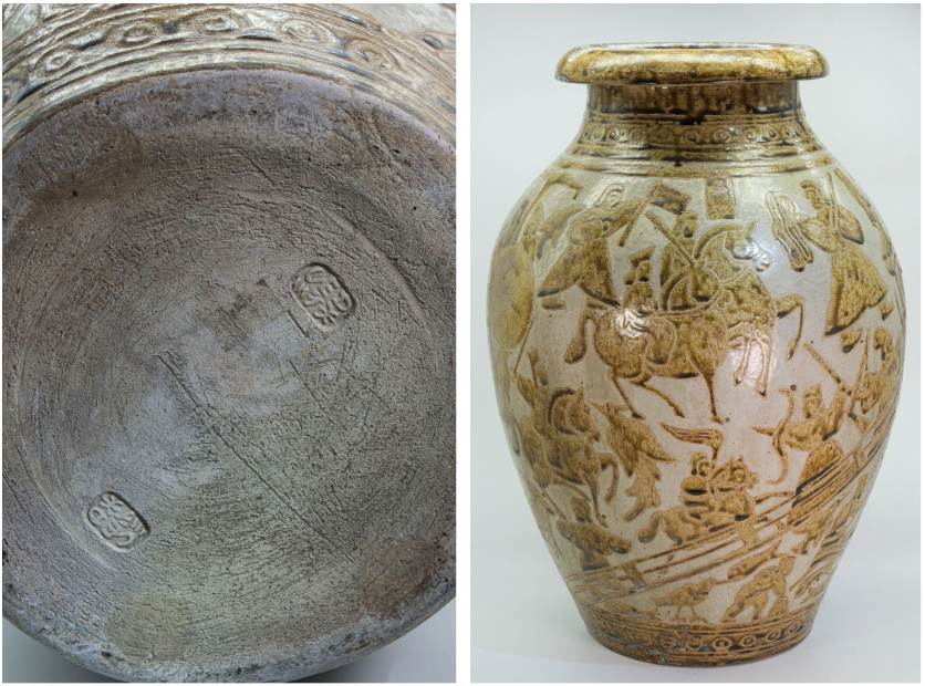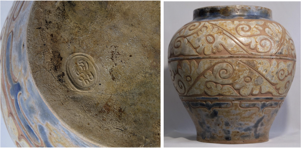Gốm Biên Hòa mộc hai chữ Hán 边和 trong khung hình bầu dục có đường viền nổi.