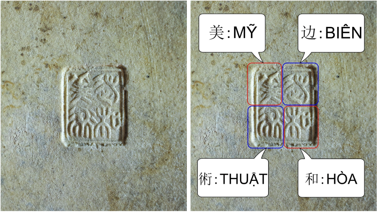 Gốm Biên Hòa mộc bốn chữ Hán 美術边和 viết lối chữ triện cổ trong khung hình chữ nhật có đường viền nổi, đóng bằng con dấu.